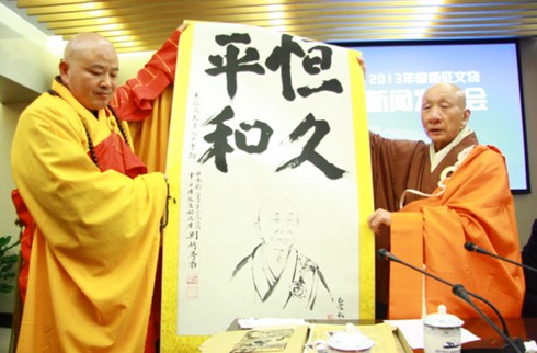 ????此次獲贈的157幅書畫作品,曾在2012年12月13日在 “佛教國際友好書法作品捐贈展”上展出。系來自中國大陸、臺灣以及日本等地的高僧和書法愛好者創(chuàng)作的書畫作品。據(jù)則竹秀南先生介紹,這些書畫作品以“祈禱世界和平、人類幸福”為主題,有他親筆題寫的《恒久平和》書法作品,以及所有參展者共同簽名完成的書法長卷。