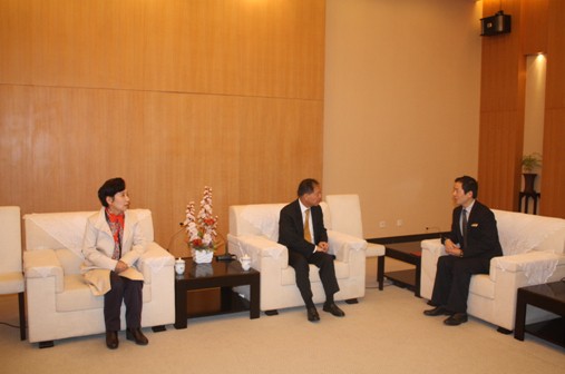 圖為陳俊峰副館長(右)與許慧玲主席(左)、劉偉民先生(中)親切交談