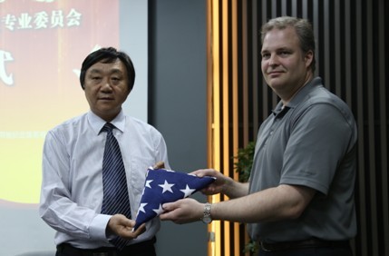 圖為羅杰斯?史蒂夫先生展示所捐美國國旗并做演講