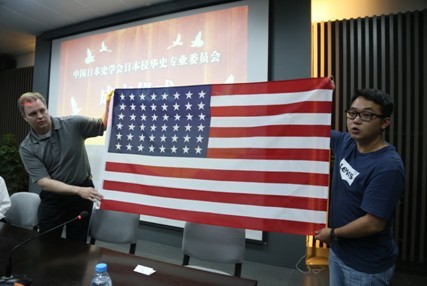 圖為羅杰斯?史蒂夫先生向南京大屠殺紀念館捐贈二戰時美國國旗