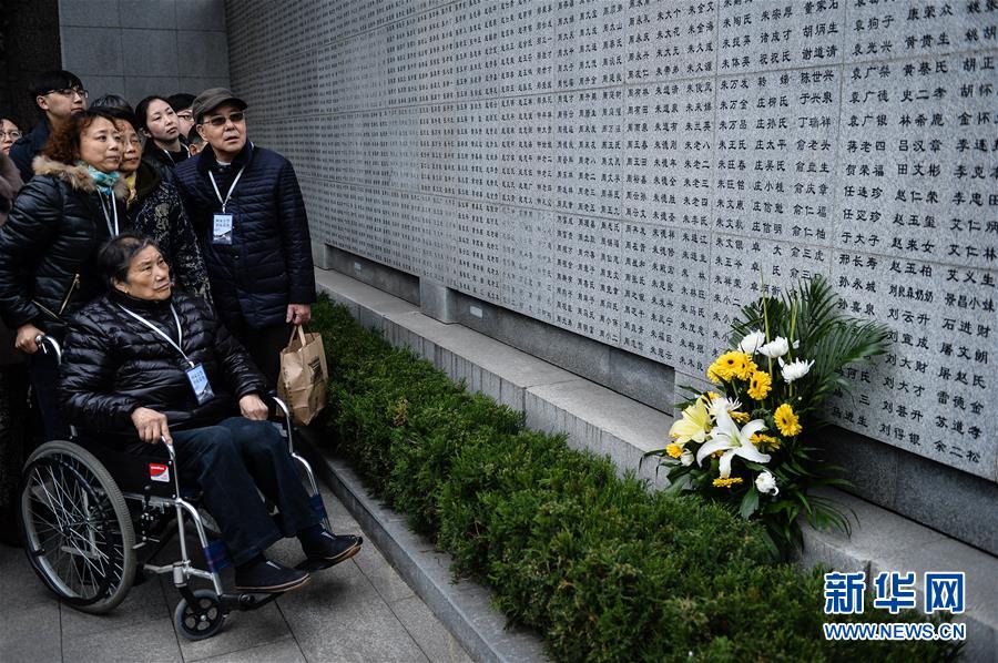 12月10日,在侵華日軍南京大屠殺遇難同胞紀(jì)念館,遇難者遺屬代表瞻仰“哭墻”上新增姓名。