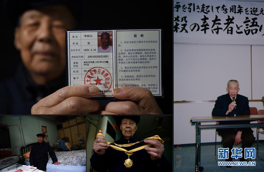 ????李高山,1925年出生于廣東茂名。1937年冬,只有十三歲的李高山作為士兵參加了南京保衛(wèi)戰(zhàn),被日軍抓捕后死里逃生。如今老人與兒子住在一起,七八年前患腦梗后腿腳不便,患有老年性耳聾,但很健談。李高山展示自己的南京大屠殺幸存者證書(2016年11月21日攝)(左上);李高山在南京家中(2016年11月21日攝)(左下);李高山展示自己的抗戰(zhàn)勝利70周年紀(jì)念章(2016年11月21日攝)(下中);1996年12月,李高山赴日證言,揭露當(dāng)年侵華日軍犯下的罪行(右)(李高山提供,翻拍照片)。 1937年12月侵華日軍制造的南京大屠殺,使30多萬手無寸鐵的中國平民和放下武器的士兵慘遭殺害,給劫后余生的幸存者留下了終身難以撫平的傷痛和苦難記憶。南京大屠殺幸存者是那段慘痛歷史的“活證”。79年歲月流逝,在世者已經(jīng)越來越少。2016年11月26日,89歲的張福智老人離世后,在冊的南京大屠殺幸存者僅剩108位。第三個(gè)國家公祭日到來之際,新華社記者選取部分具有代表性的南京大屠殺幸存者,用影像記錄他們的傷痛記憶和生活現(xiàn)狀,以銘記南京大屠殺中所有無辜受難者。新華社記者韓瑜慶、李響、季春鵬攝影報(bào)道
