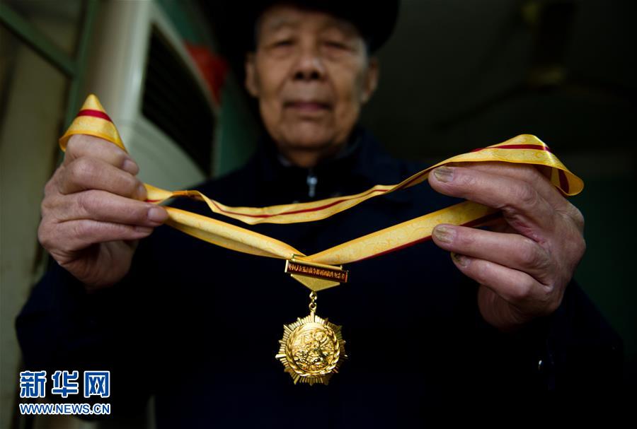 李高山展示自己的抗戰(zhàn)勝利70周年紀(jì)念章(11月21日攝)。新華社記者 李響 攝
