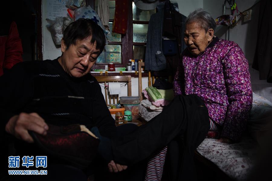 易翠蘭的兒子陶盛福在幫助老人穿戴衣物(11月25日攝)。新華社記者 李響 攝