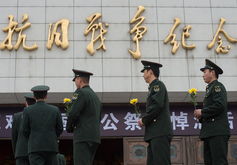 ????12月13日,來自裝甲兵工程學院的400名官兵在中國人民抗日戰爭紀念館序廳向遇難同胞敬獻鮮花。 12月13日是南京大屠殺79周年紀念日,也是第3個南京大屠殺死難者國家公祭日,各界代表、抗戰親屬在中國人民抗日戰爭紀念館舉辦紀念活動,共同悼念南京大屠殺死難者和所有在日本帝國主義侵華戰爭期間慘遭日本侵略者殺戮的死難同胞。 新華社記者 羅曉光 攝