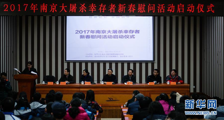????1月21日,“2017年南京大屠殺幸存者新春慰問活動啟動儀式”在侵華日軍南京大屠殺遇難同胞紀念館舉行。在農歷春節到來前,侵華日軍南京大屠殺遇難同胞紀念館組織120余位來自社會各界的志愿者看望南京大屠殺幸存者。志愿者1人到3人一組,分成62組,分批到每位南京大屠殺幸存者的家中送上新春慰問金、體檢卡、大米、食用油等,表達他們的問候。目前,在南京侵華日軍受害者援助協會登記在冊在世的南京大屠殺幸存者僅剩101人。 新華社記者李響攝