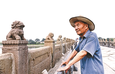 今年86歲的鄭福來站在盧溝橋上回憶往事 攝影/郝羿
