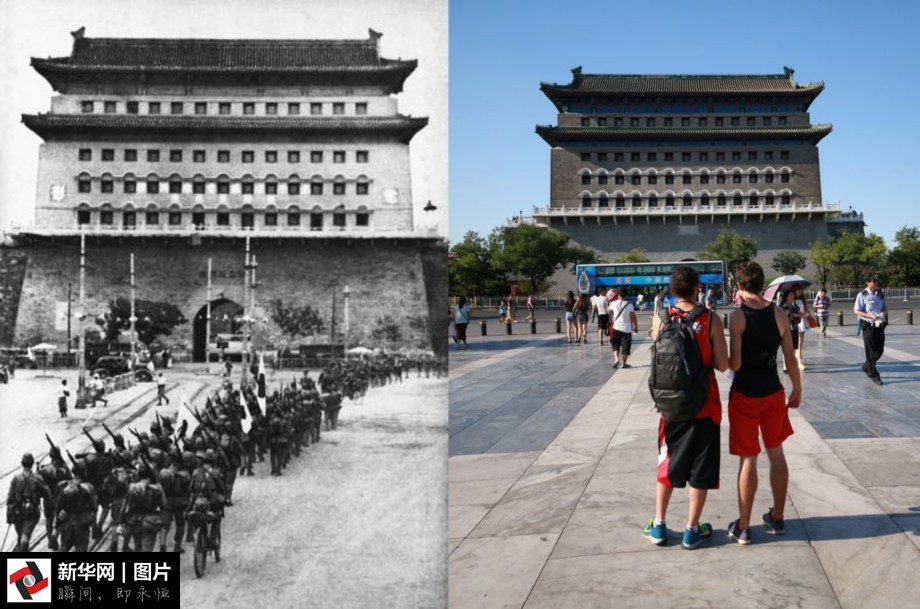 ????拼版照片上圖為:1937年8月8日,北平正陽門入城的日軍部隊。右圖為:2014年8月27日,北京,正陽門前的游客;正陽門俗稱前門,原名麗正門,至今已有500多年的歷史,是北京城內城正南方向的門,位于天安門廣場南緣,前門大街北端,處在北京城的南北中軸線上,現存城樓與箭樓。正陽門在磚砌城臺上建有城樓,占地3047平方米,城臺高13.2米,南北上沿各有1.2米高的宇墻。整座城樓的整體高度為42米,在北京所有城門中最高大的一座。