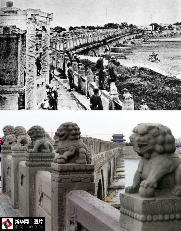 ????拼版照片上圖為:1937年7月7日夜,日本侵略軍在北平西南的盧溝橋附近,以軍事演習為名,突然向當地中國駐軍第29軍發動進攻,第29軍奮起抵抗。中國抗日民族解放戰爭從此開始。下圖為:2015年4月6日拍攝的盧溝橋。