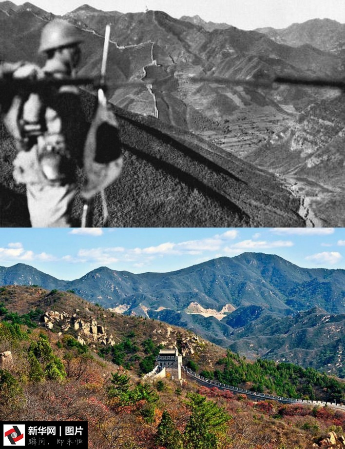 ????拼版照片上圖為:1937年8月23日,居庸關附近,突破長城線后山頂上警戒的日軍士兵。下圖為:2009年10月13日拍攝的位于北京市延慶縣軍都山關溝古道北口,是明長城的一個隘口。八達嶺長城為居庸關的重要前哨,古稱“居庸之險不在關而在八達嶺”。