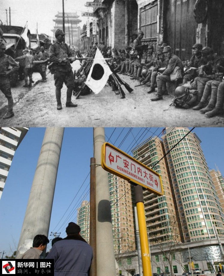 ????拼版照片上圖為:1937年8月8日,北平廣安門附近街上,進食的日軍士兵。下圖為近年來拍攝的北京最古老的大街之一——廣安門大街。