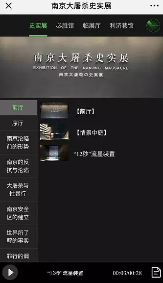 ????前廳、序廳、南京淪陷前的形勢、南京的反抗與淪陷、大屠殺與性暴行、南京安全區的建立、世界所了解的事實、罪行的調查與審判、大屠殺死難者公祭