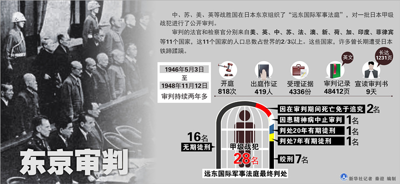 ????1946年5月3日至1948年11月12日,美、中、英、蘇等11國在日本東京開設了遠東國際軍事法庭,審判發動二戰的元兇之一:日本軍國主義統治集團。這場人類有史以來規模最大、時間最長的國際審判,被稱為“東京審判”,是奠定了二戰后國際秩序的重要法律基石。東條英機等7人被判處絞刑。圖片來源:新華網