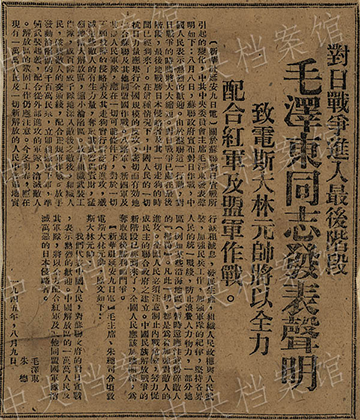 1945年8月9日,毛澤東發(fā)表《對日寇的最后一戰(zhàn)》,致電斯大林元帥,表示將全力配合紅軍及盟軍作戰(zhàn)。