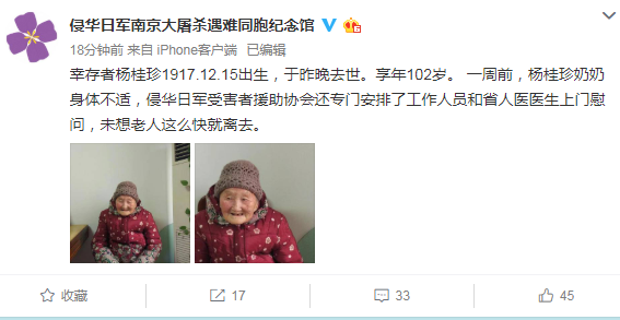 ????11月6日,從侵華日軍南京大屠殺遇難同胞紀念館獲悉,南京大屠殺幸存者楊桂珍老人于昨晚去世,享年102歲。