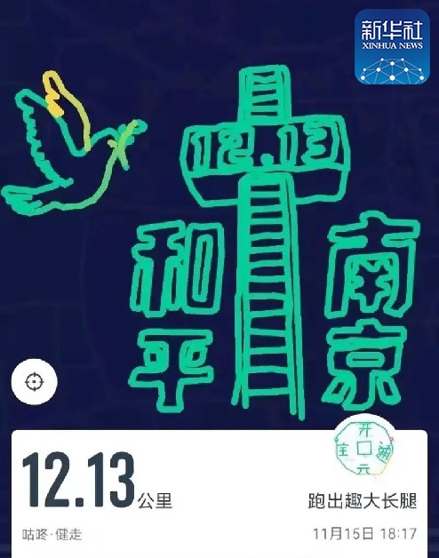 ????“碑是南京大屠殺紀(jì)念碑,原本紀(jì)念碑上的數(shù)字是1937.12.13,受限于跑步場(chǎng)地而簡(jiǎn)化成12.13。鴿子銜著橄欖枝飛過(guò)來(lái),意味著在這片人間煉獄里也有相對(duì)安全的場(chǎng)所。”成都跑友“跑出趣大長(zhǎng)腿”介紹自己跑出的軌跡圖案時(shí)說(shuō),經(jīng)過(guò)前期設(shè)計(jì)跑步圖案,自己對(duì)南京大屠殺這段歷史的了解又深了一層。