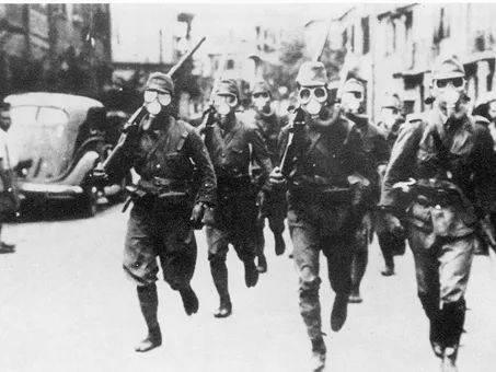 ????淞滬會(huì)戰(zhàn)中穿戴防毒面具的日軍(圖片來(lái)源:黑龍江省社會(huì)科學(xué)院)