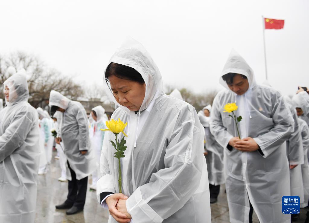 ????4月4日,社會各界代表在啟動儀式上向在抗戰(zhàn)中英勇犧牲的烈士默哀。