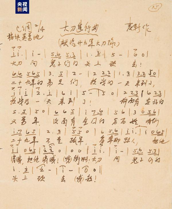 東北烈士紀念館首次展出《大刀進行曲》手稿原件