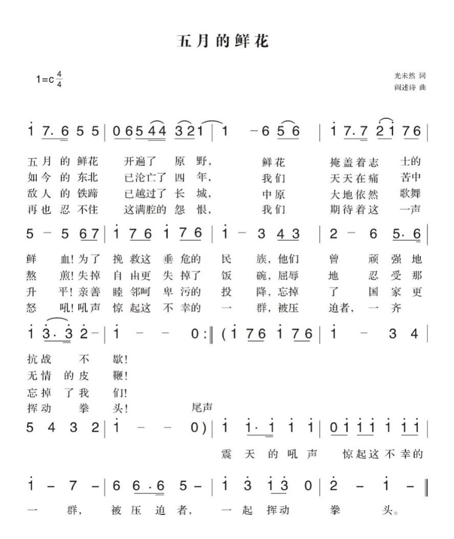 ????“五月的鮮花開遍了原野,鮮花遮蓋著志士的鮮血,為了挽救這垂危的民族,他們曾頑強的抗戰不歇……”這段激動人心的歌詞出自另一首著名的抗戰歌曲《五月的鮮花》,而曲作者就是親歷“一二·九”運動的東北大學青年教師閻述詩。