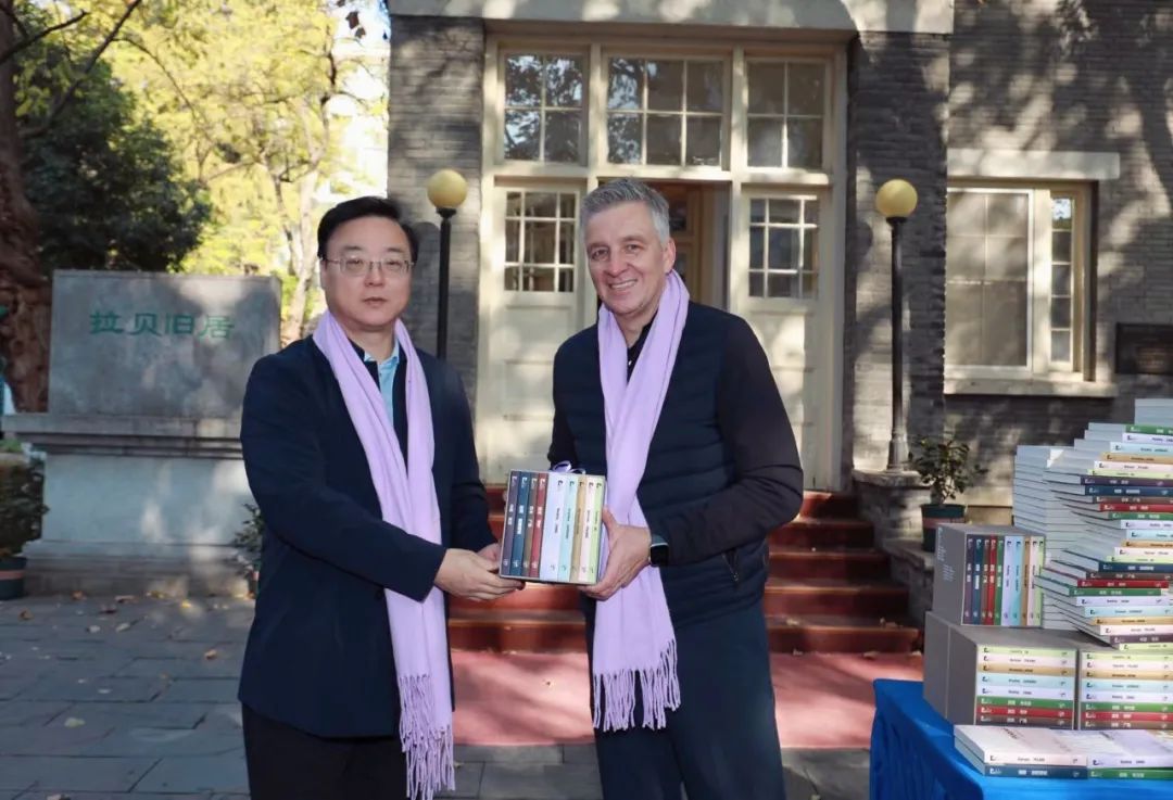 ????活動當(dāng)天,中共南京市委宣傳部副部長、侵華日軍南京大屠殺遇難同胞紀(jì)念館館長周峰向博西家電集團(tuán)大中華區(qū)高級副總裁兼首席運(yùn)營官金世峰贈送《國際和平城市叢書·中國南京》。