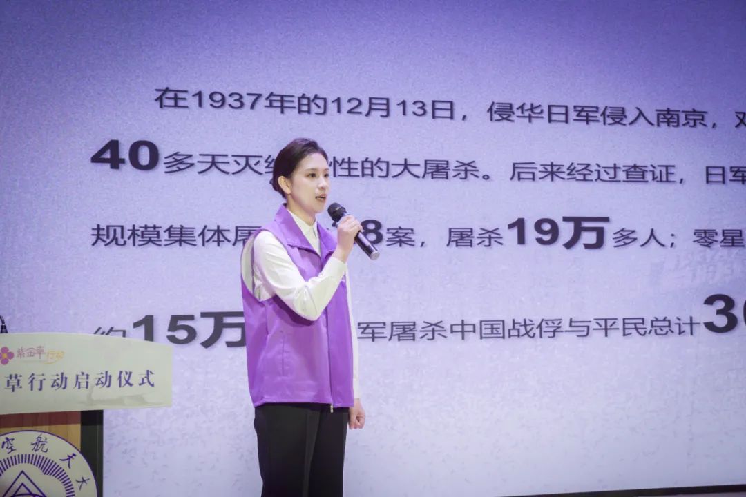 ??南京航空航天大學的志愿者蘭美霖進行了主題宣講,介紹了“紫金草行動”的由來與意義。