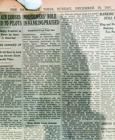 ????1937年12月19日美國《紐約時報》第38頁文章《外籍人士在南京的作用受到贊揚》。