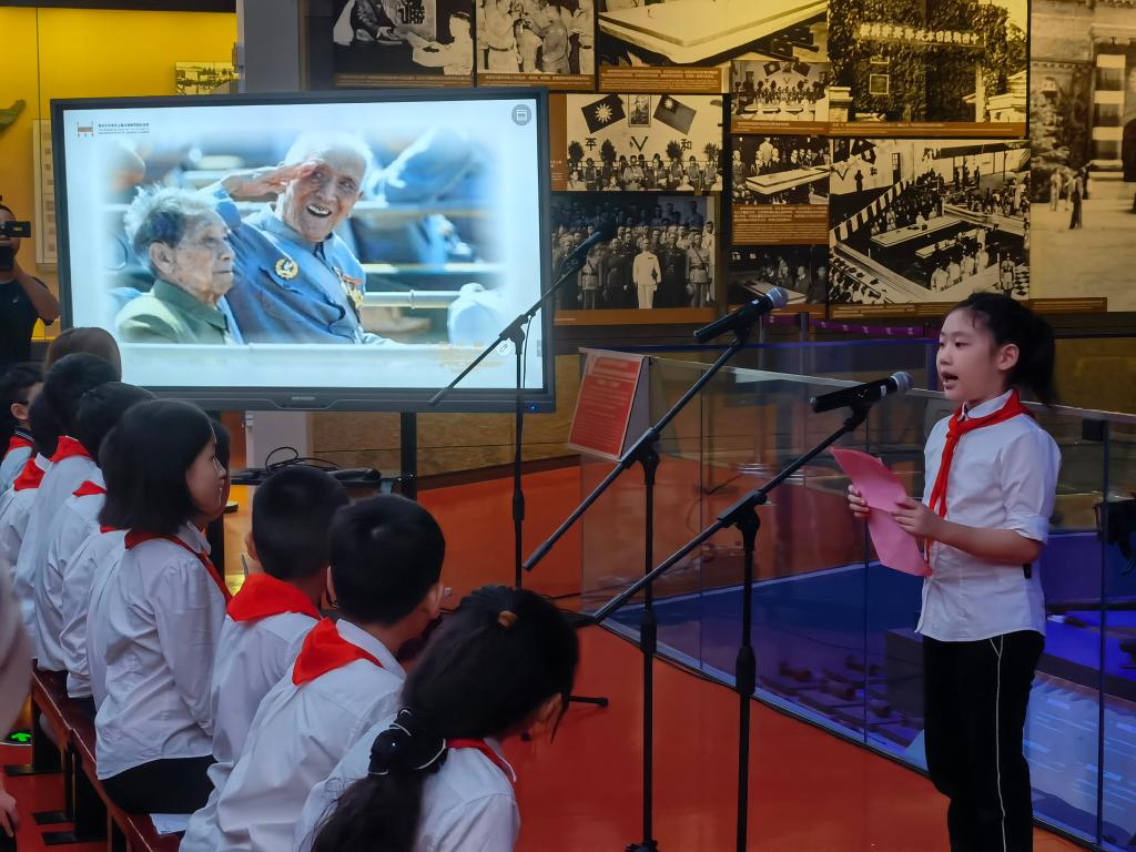 ????南京市科睿小學二年級學生章若初為大家講述抗戰老兵手印的故事。 新華社記者 邱冰清 攝
