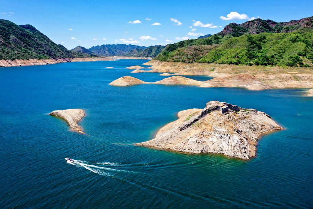 ????2012年8月13日,在河北寬城滿族自治縣潘家口水庫“水下長城”景區(qū),一船只從城墻邊駛過。