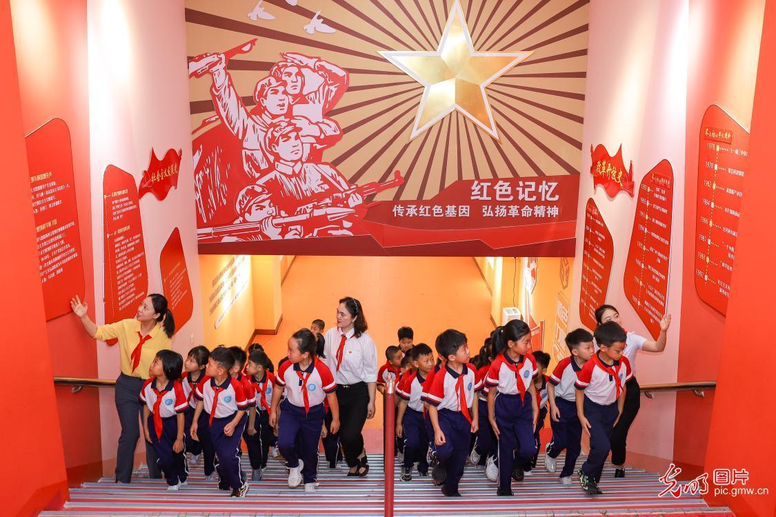 2024年9月3日,在山東省青島市李滄區(qū)實驗小學,學生在老師帶領下參觀校內(nèi)紅色長廊。(張鷹攝/光明圖片)