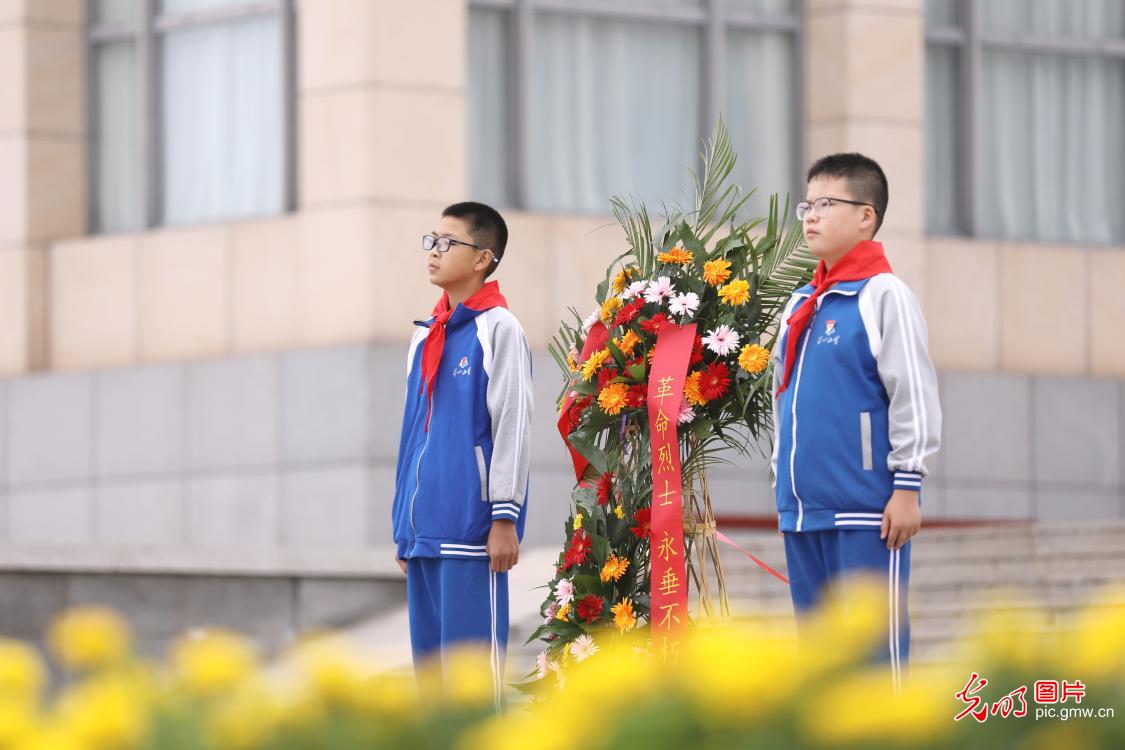 2024年9月3日,山西省長治市武鄉(xiāng)縣五一小學學生在八路軍太行紀念館舉行獻花籃儀式。(李勇攝/光明圖片)